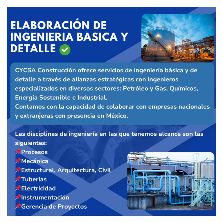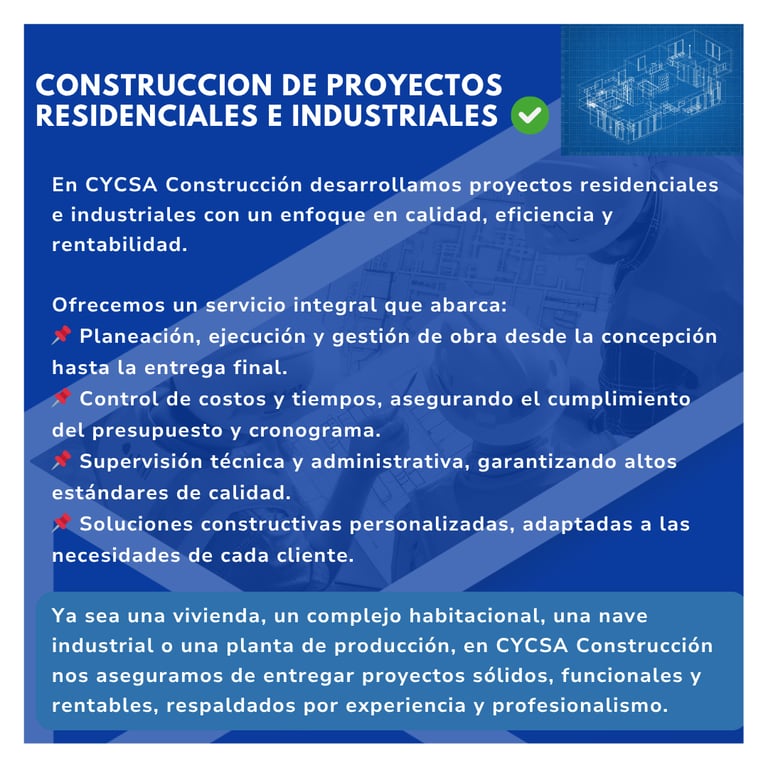 En CYCSA impulsamos el crecimiento industrial con ingeniería, planeación y ejecución de alto nivel. Desarrollamos proyectos que cumplen los más estrictos estándares de calidad, seguridad y eficiencia, optimizando tiempos y costos sin comprometer la excelencia.